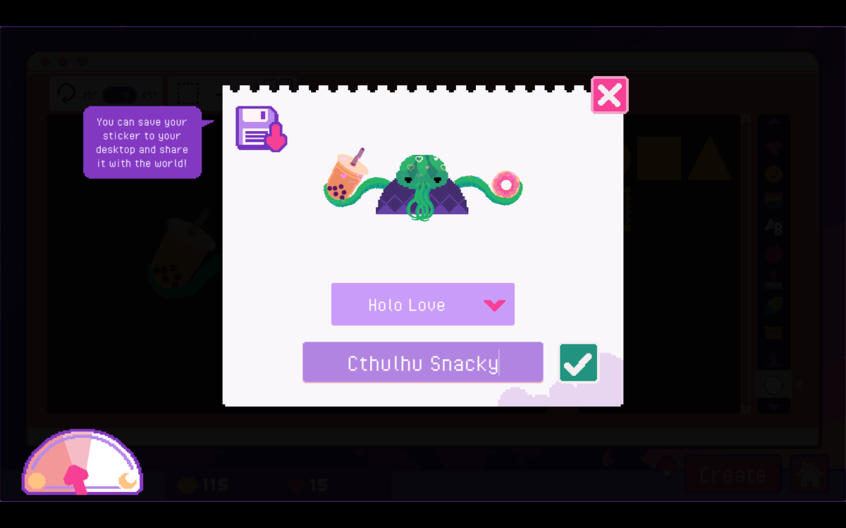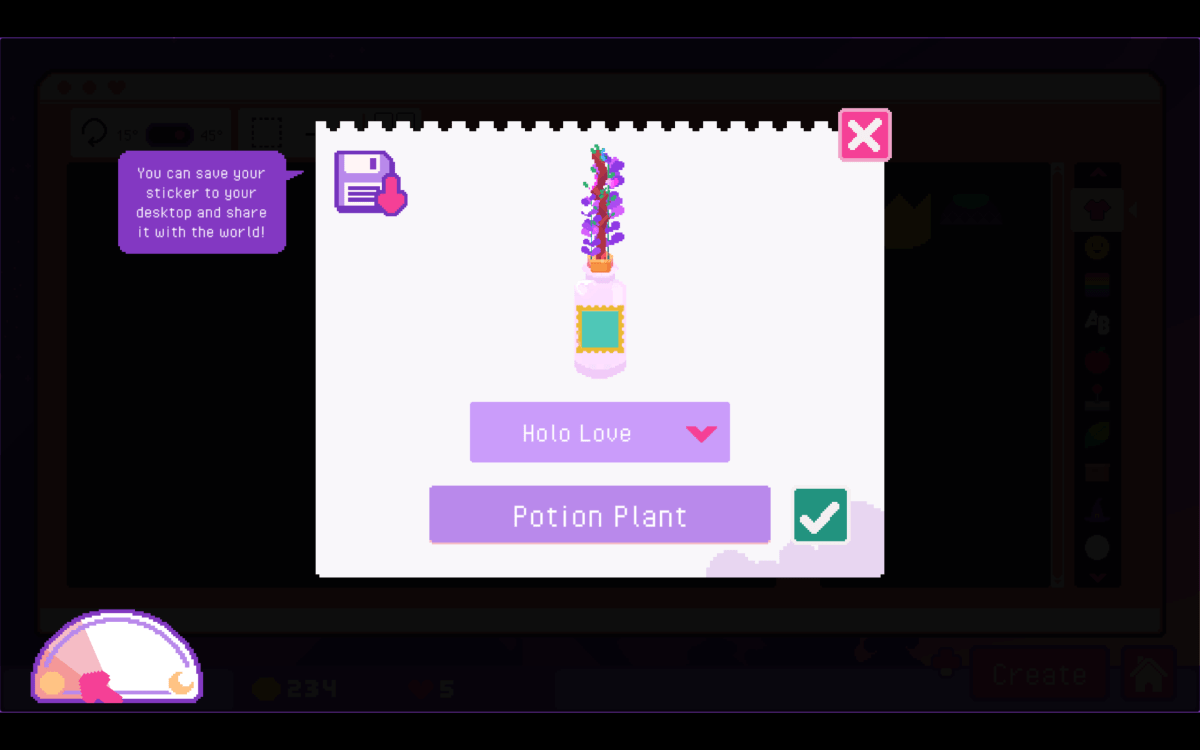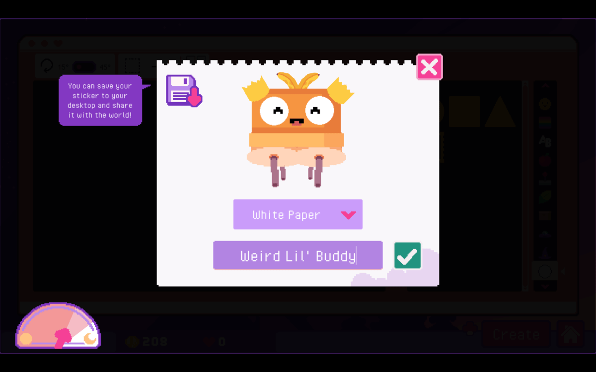 I keep coming back to Sticky Business. I want to experiment with the restrictions to see what designs I can create. It’s like one of those virtual paper doll creators I enjoyed in high school, only with a little bit of a simulation surrounding it. It is a little light on the actual “game” elements, but it’s very good at establishing a cozy, creative vibe. In Sticky Business, you start with a blank slate. After naming your storefront, something that really doesn’t come up after that, you are plopped into a creator. You can use the “parts,” divided into categories, to make a sticker. There are a handful of sizing options, occasionally you’ll be able to change the color (if you paid for the extra color), you name it, and then you choose if it is a plain one or printed on a special kind of paper. This takes up a certain amount of the “day,” if you are playing on a timed mode. Once you have stickers, you pay coins to print them after placing them on sheets. Orders come in, you fill them, and you ship them out. The downside is, it also doesn’t really explain what some “game” like elements mean. Parts used in the stickers you sell earn experience, but I didn’t really see how that influenced anything.