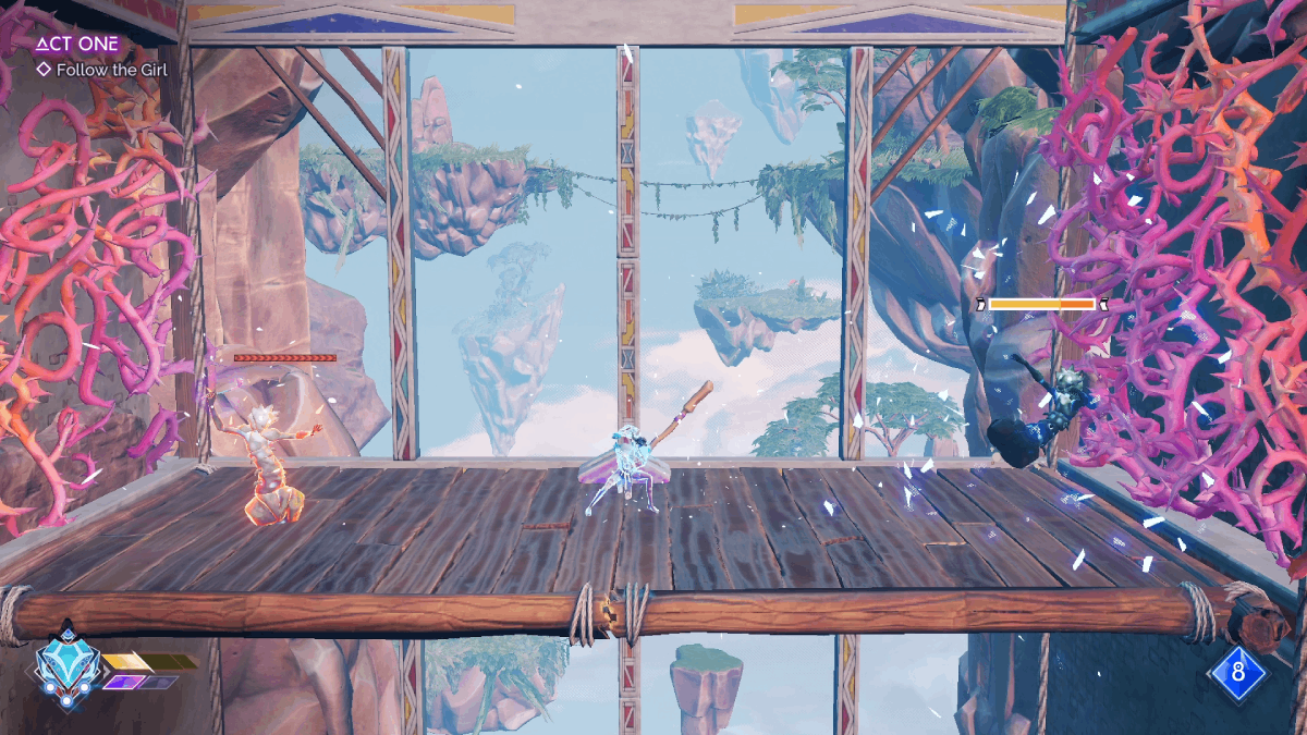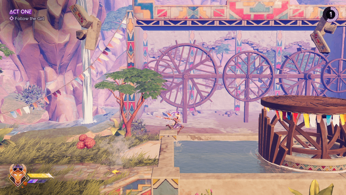 Platforming is also a blast, with each area built as a series of parkour obstacle courses. You’ll hop off walls, air dash over dangers and slide under low-hanging door frames. Each new ability you get adds to this, with a grappling hook, a directional dash, a glide and a way to turn waterfalls into new walls to jump off. Most of the game involves you dashing through platforming challenges that feature a natural flow that’s incredibly satisfying to pull off.
