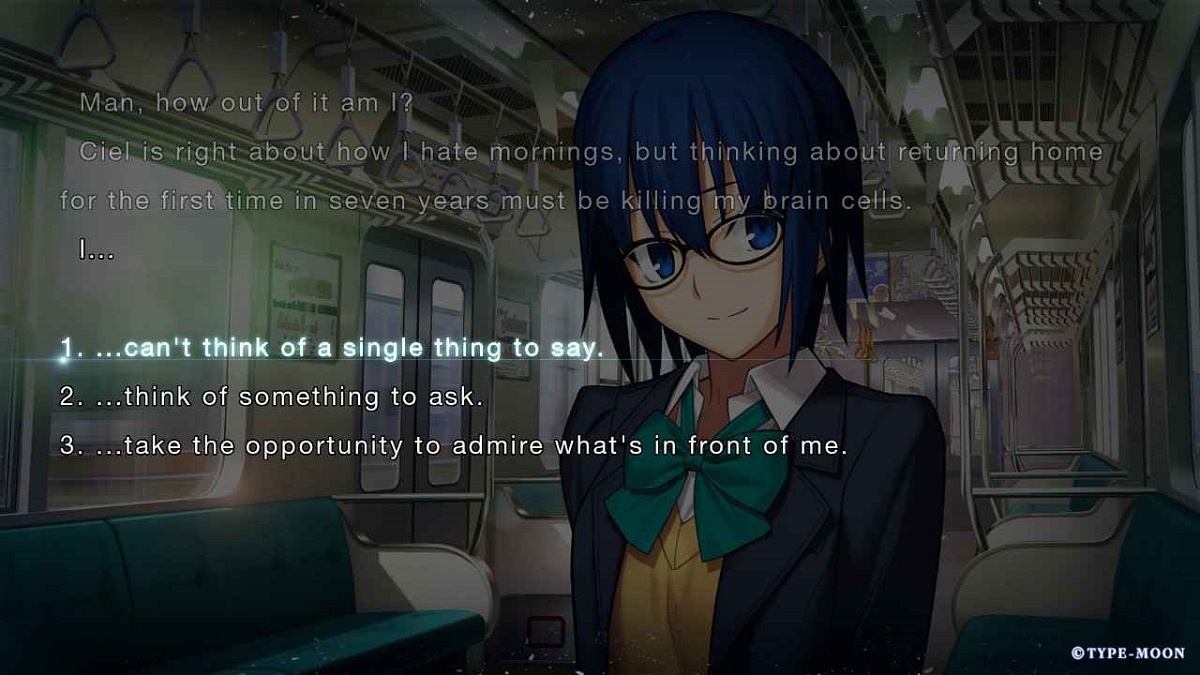 As for the gameplay, it’s a visual novel with several routes and endings. At times, you’ll need to choose between several options. You can check back at any time in the flowchart what you chose at certain scenes. Some scenes have prerequisites. For example, you need to make Mio scold you when you’re with Ciel on the train to unlock another event later. Some endings might lead you to a dead end, in which case a humorous section with Miss Ciel and Neco-Arc will help you figure out what you needed to do instead. Of course, you could also be like me and kill Shiki on purpose in order to see more of this comedy duo. It added a level of replayability that I appreciated, since it was fun to explore and look for the different possibitilies and conversations.