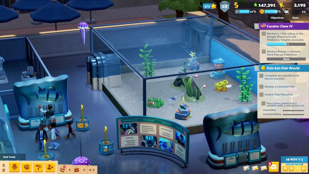 Just like the exhibits, some of the locations your employees travel to are pretty out there, like an ice cave or an outer space planet filled with cheese. If you send out unprepared staff members to an expedition, there’s a high chance that they’ll get injured or develop an illness. This is why ensuring your staff members are trained in particular skills to combat these potential scenarios is essential, which adds another strategic layer to the gameplay. Expeditions are by far my new favorite feature. It’s a constant juggling act managing the museum’s day-to-day operations whilst simultaneously sending out staff in the background to go out on expeditions. It’s also quite exciting when the expedition ends and staff return with a new relic for the museum. Putting a new tropical fish in an aquarium or building up a full-length dinosaur was oddly satisfying.