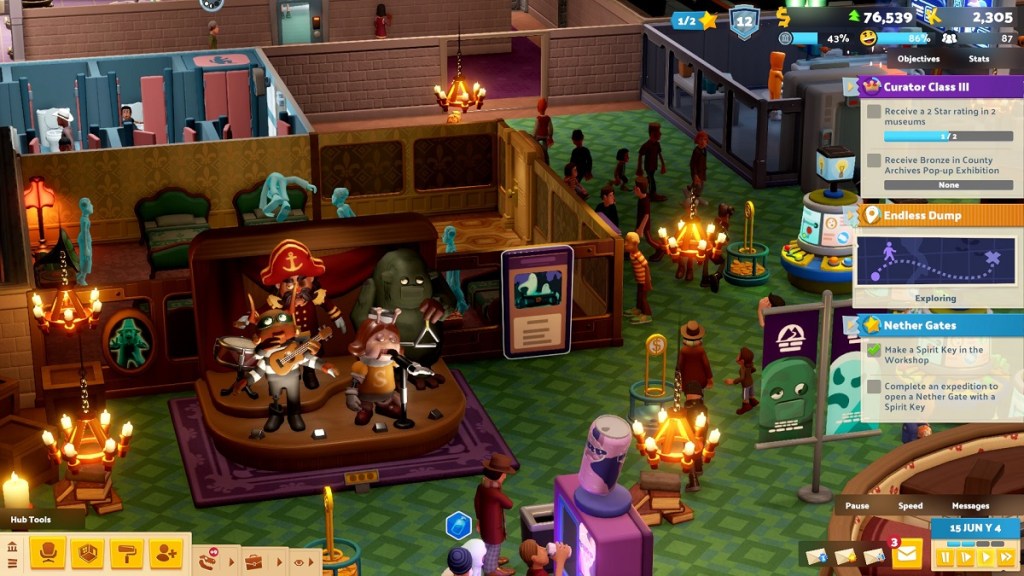 The campaign starts with you stepping into a once-grand museum that has been abandoned and fallen into disarray due to neglect. Your mission is to revitalize this cultural gem while ensuring the Department of Culture is satisfied with your progress. This involves various responsibilities, such as hiring and managing staff, attracting visitors and generating profits. All these mechanics are explained in a nice, welcoming manner, making Two Point Museum very newcomer-friendly. The first few hours of the gameplay also reflect this gentle tone, although obtaining some later ratings will require quick action and out-of-the-box thinking.