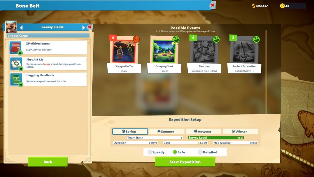 However, you cannot obtain these exhibits by looking at a glossy catalogue and choosing what you want. Instead, you’ll have to get them the old-fashioned way by grabbing them yourself. To do this, you’ll have to send out staff members to find the exhibits in expeditions. To begin this operation, you’ll need to access the museum’s business helicopter (let’s put aside concerns about carbon footprints, as there are incredible wonders to discover). You can then assemble your dream Indiana Jones team to explore the wilderness. Think of it like an effective team scouting system.