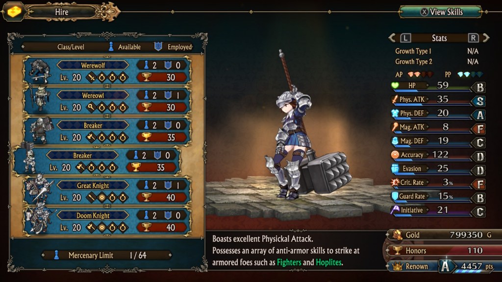 Speaking of character appearance, some of these designs are particularly egregious, especially in the generic recruits of the same class that you can just hold up next to each other and compare. Guys wear protective armor and feature a whole range of body types. The women? They’re all small, they’re all cute, and often they show up for war in fetish gear. So much of this game is fun and good, and the Vanillaware art style is genuinely beautiful, but this has got to stop. It makes it tough to recommend to anyone when there’s so much of this and it’s unavoidable, no matter how compelling the strategy gameplay manages to be.