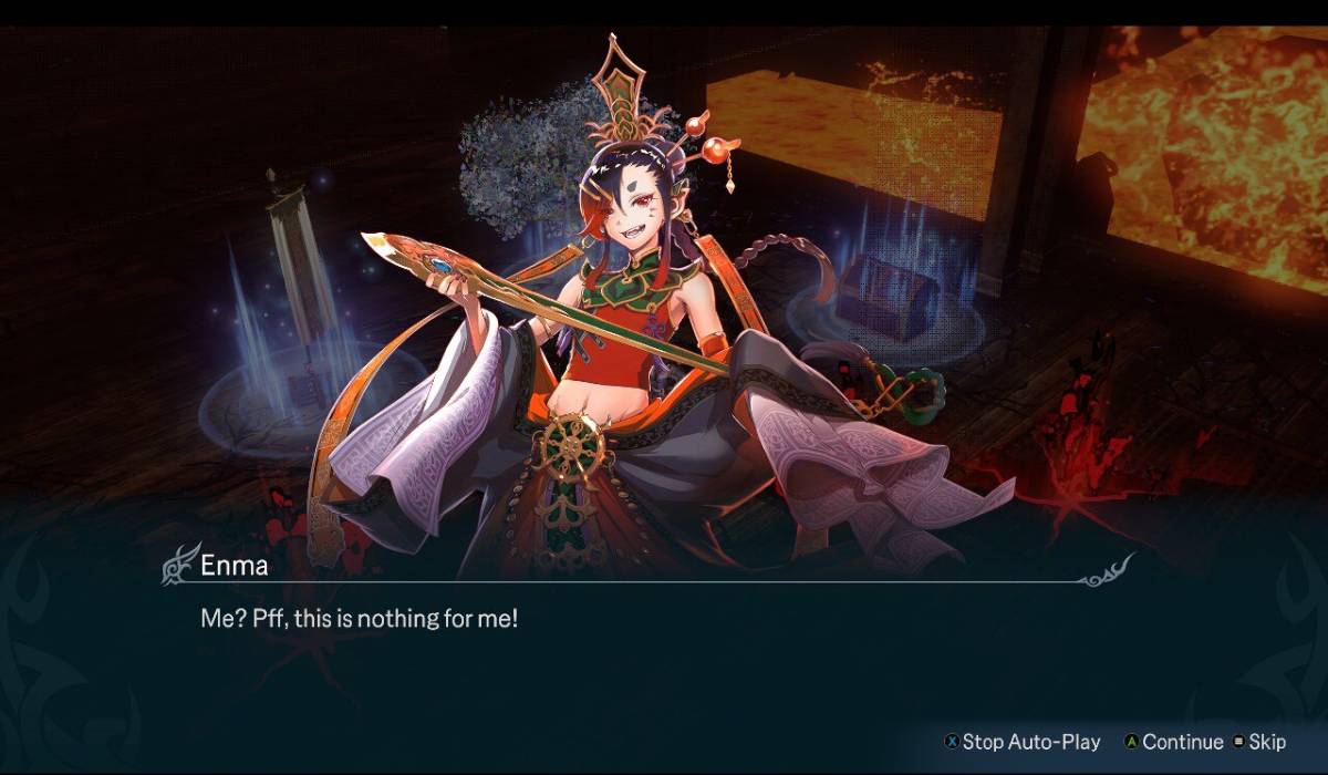 Unfortunately, one area where it could have taken more notes from Hades was in its story and writing. The ruler of the underworld, Enma, has been stripped of most of his powers and monsters are running rampant. He summons some great heroes from the world of the living to help him out, and that’s about the size of it. You’ll get some short, vapid conversations here and there to progress the story, usually after defeating a boss for the first time. Sometimes you’ll be prompted to respond by making a choice, but it doesn’t really matter. But it’s a dull story, and the writing is perfunctory at best.