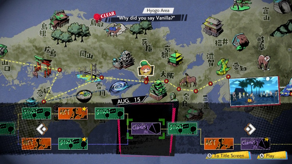 World’s End Club is divided into three scene types: Story, Camp, and Act. It weighs heavily on the Story and Camp sections, making this adventure more of a visual novel with some platforming on the side. Most story scenes are just that: reading your way through the antics of these middle schoolers. In between the confusion of their strange surroundings and squabbles, these segments drive the Go-Getters Club forward. A lot of the time it’s what you would expect when a dozen underaged but brilliant kids are left without any sort of guidance. Emotions run high, they break down in tears, and at the root of it all is a tragedy each one claims responsibility for. Camp scenarios allow player character Reycho the opportunity to speak with his classmates. While gathered around the fire, you can speak with each person and learn a little more about them. Hopes and dreams, fears and regrets. Occasionally you’ll be able to speak to someone more than once. These additional scenes may include other members of the group. Of course, you can skip them if you want or only speak to the characters you like before pushing the story forward. Even if you accidentally end a Camp session, World’s End Club lets you replay any scenario you’ve completed.