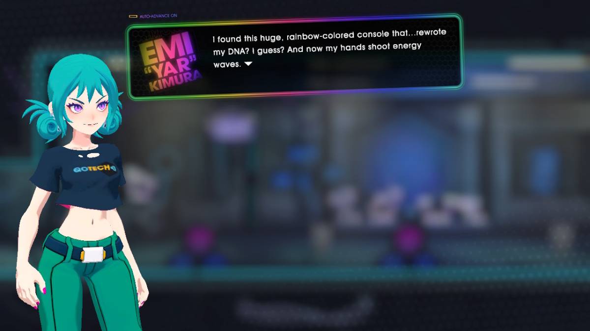 Emi “Yars” Kimura is a hacker. She’s working with a group of her friends to infiltrate an obviously evil organization called QoTech. That means pretending to work as an employee until she gets a chance to sneak into the server room, attach a USB dongle and get out. She manages that! But immediately after she does, she’s caught and thrown into a “holding” center in the building. After sneaking through some vents and hacking into an unusual terminal, she finds herself with new biohacks that augment her abilities, giving her the ability to shoot or generate energy wings to dash or jump. Armed with these new talents she aims to get out and deal with the ruthless execs and their minions.