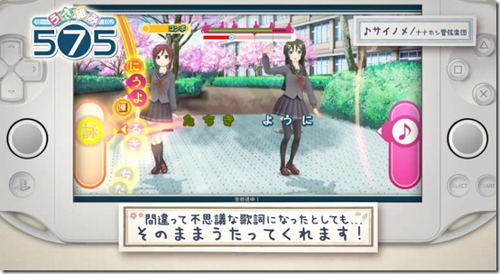 For those wondering and worried about how the music parts stack up, let’s just backtrack real quick—Project 575 isn’t your normal music rhythm game. In addition to hitting buttons in tune with the song, the game will utilize the Vita’s touchscreen function to introduce lyrics periodically throughout the song which you need to quickly select in the right order. These are based on the 5-7-5 pentameter which haiku fans might be familiar with. Once you’ve made your input, the girls will sing them in the next line of the song. It adds a little bit more interaction with the song itself than other music games might. Some of the songs will come from Vocaloid song creators like Lamaze-P, Yu-chan-P, TokyoToko and others as well. The video also showed off the dozens of costumes players can have the characters wear (With Azuki sounding like she’s a little horrified at what she’s wrought into this world having to put them on) which don’t actually look that outlandish for normal high-school girls. There’s a cheerleading outfit, rainy day raincoat set, and waitress outfit as some of those you can obtain. There will also be some 30 locations to choose from or play as backgrounds against in the game. Project 575 will be out for the PlayStation Vita January 23.