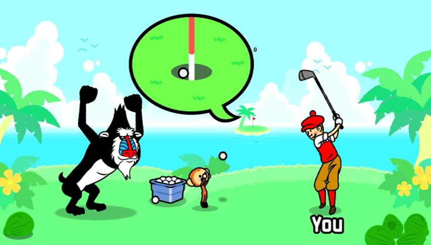 Simple controls, but in some ways Rhythm Heaven Fever is more difficult than Rock Band or Guitar Freaks. The game begins with a rhythm test that introduces the idea of following the rhythm in your mind. With few visual cues and no notes to follow, the key to Rhythm Heaven is tapping to the beat. I learned how to do that from a monkey caddy in the first game, Hole in One, where a chimp throws a golf ball and you swing at it by pressing A. Hit the ball on beat and you’ll send it flying right into the hole. To mix things up, there’s also a mandrill who lobs golf balls at a different rhythm count.