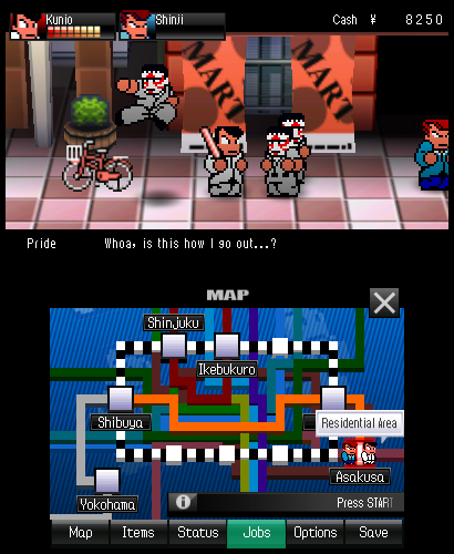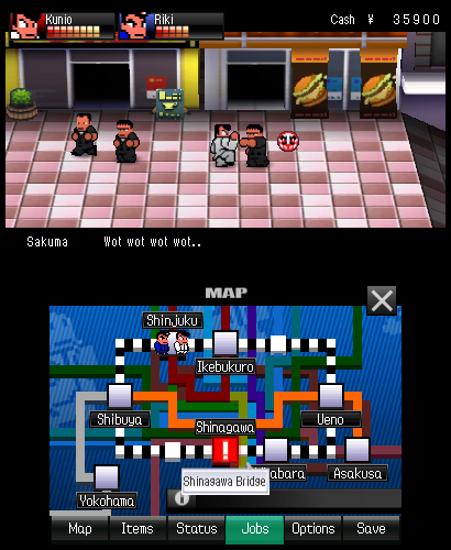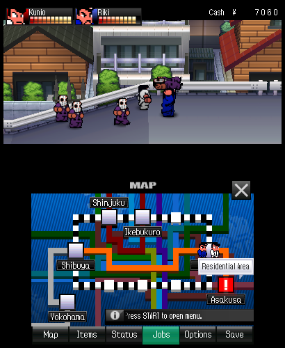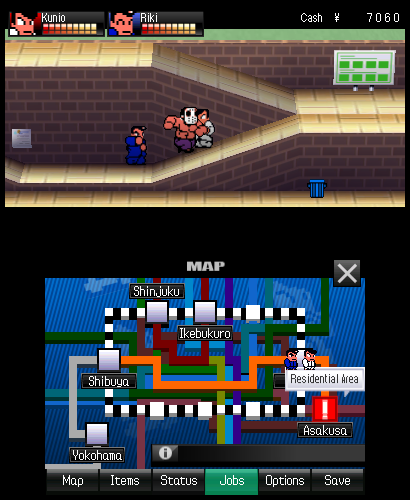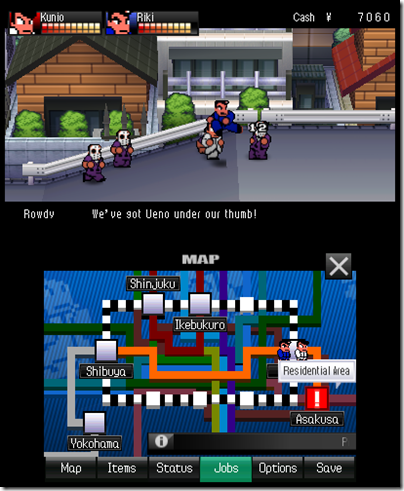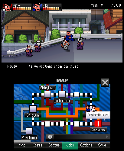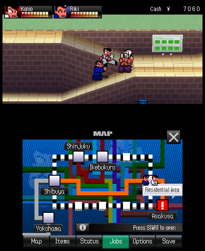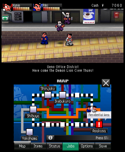 While most of the new River City: Tokyo Rumble screens show Kunio in-transit between areas, fighting all sorts of thugs, it also offers an opportunity to see some of the locations he’ll be visiting in the game. For example, a screenshot taken in Shinjuku shows Kunio in a shopping district, near a Tech Burger. It also notes one of his jobs, Shinjuku Patrol, which will give him ¥500 for defeating 20 Hanazono punks in the area. Ueno is an office district, with quite a few professional buildings.