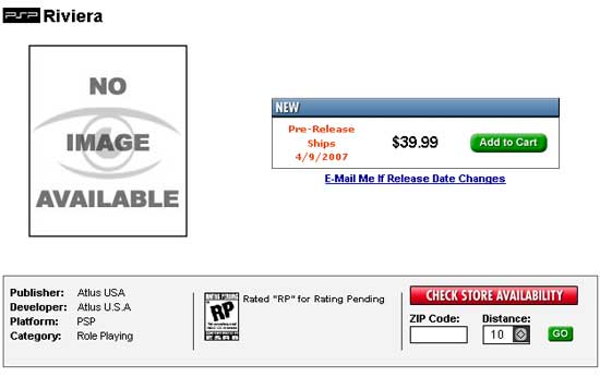 All of the Atlus news has been focused on either Izuna: Legend of the Unemployed Ninja of Monster Kingdom: Jewel Summoner. Both games come out this month and maybe Atlus has been too busy to announce they picked up Riviera: Yakusoku no Chi for a North American release. Gamestop / EB Games has a page up for it with an April 9, 2007 release date. The PSP remake has improved graphics and is fully voiced compared to the GBA release which had sound clips. It’s entirely possible that Atlus picked this up since they worked with Sting to bring the GBA game over. Or maybe Gamestop is over zealously trying to entice RPG fans to buy PSP games, just yesterday Gamestop set up pre-order pages for Final Fantasy I and II.