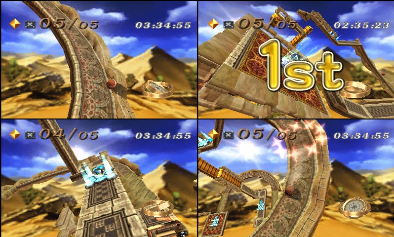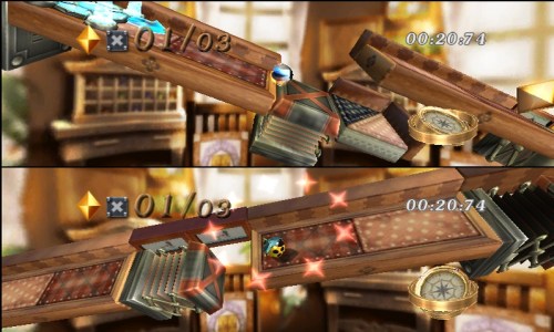 Marble Saga: Kororinpa seems fairly forgiving. There were infinite balls and no time limits. Of course, I did get a bit frustrated while playing the fourth and fifth levels in the demo, as I didn’t master either initially. The fifth stage, which is a snow level with occasional icy platforms, was particularly challenging. Thank goodness save spots started appearing in the fourth and fifth levels, so I wouldn’t have to redo tricky segments managed to pass.