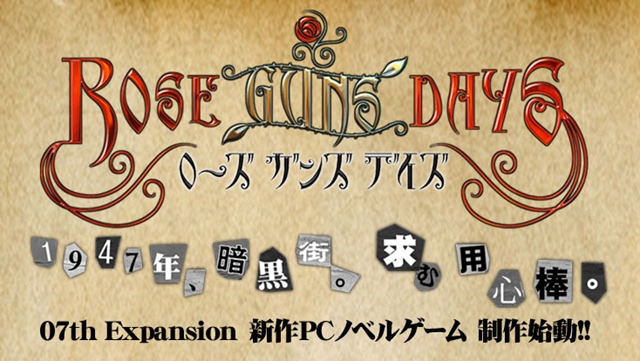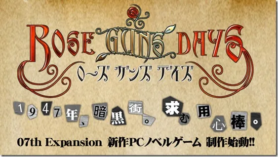Rose Guns Days is a PC visual novel, and is being produced by Ryukishi07’s doujin circle, 07th Expansion. The text reads “1947, a city by night. A searching bodyguard.” Make of that what you will.