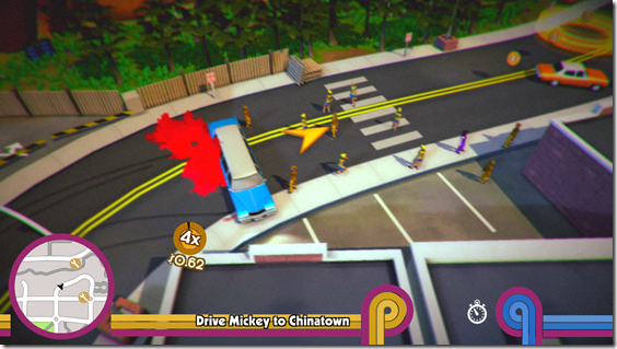 No Goblin’s zany arcade driving game Roundabout is now released and available to purchase for PC. It will be coming to Xbox One and PS4 in early 2015. Roundabout owes as much to Kuru Kuru Kururin as it does to Crazy Taxi. Driving a revolving limousine, you aim to pick up as many passengers as possible and deliver them to their destinations. As you’re constantly spinning, you need the right timing to get past obstacles, buildings, and around traffic-filled roads. There’s a full-motion video throughout the game that tells the rise-to-fame story of chauffeur Georgio Manos in 1977. It’s as ‘70s B-Movie as it gets, mixing well with the games kitschy humor and cartoon violence. It shouldn’t come as too much of a surprise to find out that No Goblin contains a few people that worked on similarly B-Movie action game Destroy All Humans!