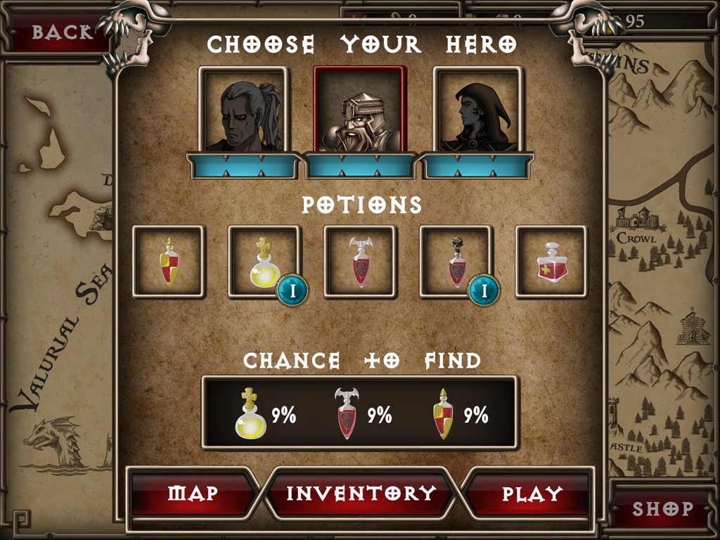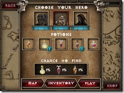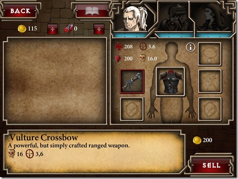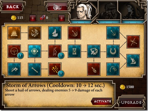 The trick is knowing which skill to use and level up the most. Leveling up the wrong skill can prove to be deadly for upcoming levels. The other element to Dawnkeeper that makes the game interesting are all the various pieces of equipment that can be obtained. Armor, weapons, rings, and various potions can be bought or found to really give a hero an edge in battle. Like with the skills, picking the right pieces of equipment can mean the difference between winning or losing a level.