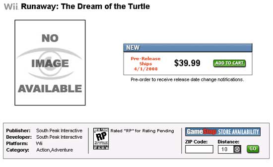 Cyanide previously announced they were bringing Runaway: Dream of the Turtle from PCs to the Nintendo DS later this year. I suppose a Nintendo Wii version shouldn’t be too hard to swallow then? Gamestop had a listing for such a project with South Peak Interactive as the publisher. As quickly as it appeared it vanished, but I got a screen capture, which is past the break.