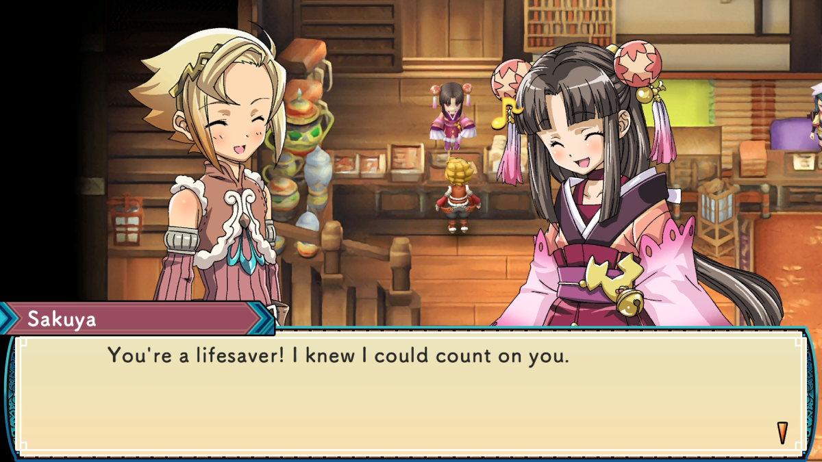 Sakuya’s shop at the inn trades in unusual items dropped by monsters. Naturally, due to how little she wants to face those monsters, she is grateful for anything you can give her to fix this problem. The best items to give her are those dropped by bosses. This includes the Tanuki Leaf, Dragon Bones, Red/Blue Lion Fur and Broken Ice Wall from the game’s four main bosses. She also loves items dropped by the mini bosses that can be fought on the island in the middle of Privera Forest. If this is too much work, you can simply make her a Charm in the Workshop. You can also get her some Wooly Furballs if you can bear to attack a Wooly or two in Privera Forest.