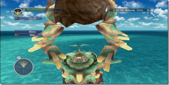 Actually, I’m not even sure what to call the farming aspect in Rune Factory: Tides of Destiny. It’s more of a management experience, rather than an actual hands-on farming simulation like in the previous Harvest Moon and Rune Factory games. When you find a dead island, you bring collected spirits there to revive it and make more planting plots available. You then equip the spirit wand, look around for a viable, highlighted ring where a plant could grow and wave the action button. Voila! You’ve just made a crop grow. Then, you have to assign a monster capable of growing a kind of produce or flower to the island, purchase some monster cookies from Bismark and Sierra’s shop so there’s a stockpile in Ymir for working monsters to grab and come back to the island in a week to collect the crops your monsters harvested.