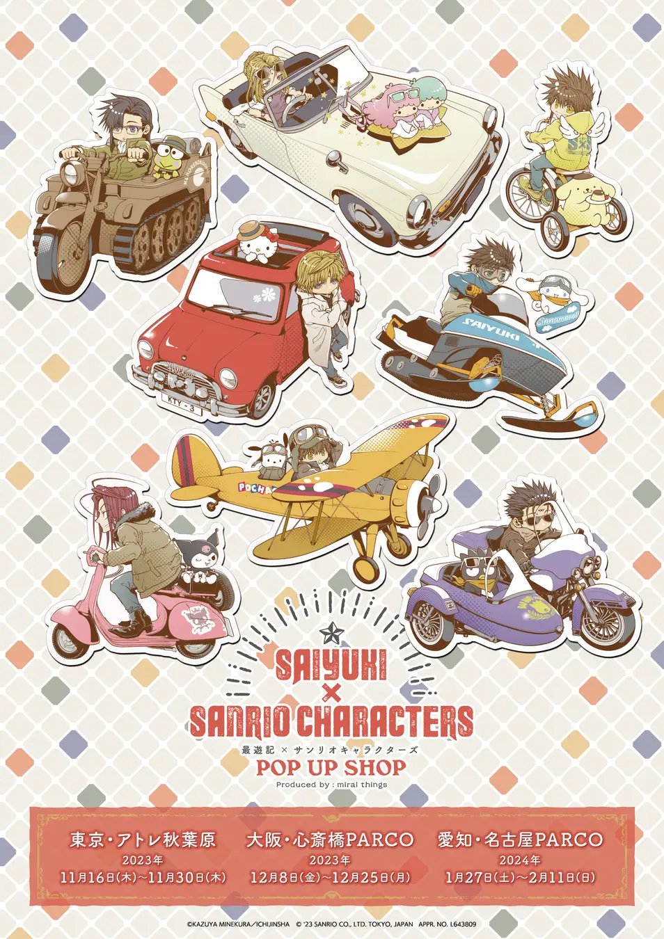 Mirai Things will produce the Saiyuki x Sanrio characters collaboration merchandise. The collection will feature new illustrations drawn by the original author and illustrator of Saiyuki, Kazuya Minekura. The chosen Sanrio mascots for the collaboration will be Hello Kitty, Kuromi, Pochacco, Badtz-Maru, Keroppi, Pompompurin, Cinnamoroll, and Little Twin Stars. The pop-up shops that will sell these goods will be open at different times from November 16, 2023, to February 11, 2024.