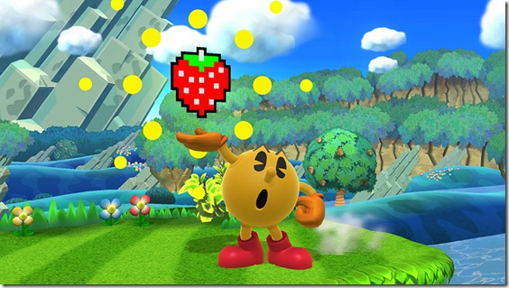Last night, Super Smash Bros. director Masahiro Sakurai took to Miiverse to highlight one of Pac-Man’s moves in the game. “Pac-Man’s standard special move, Bonus Fruit,” Sakurai wrote, alongside the screenshot above. “As you charge this move, the bonuses will change, and all of them have different characteristics and movement patterns when thrown.” “The bonuses cycle in the same order as in the original game, and the charge-up period doubles once you cycle beyond the orange.” Super Smash Bros. is in development for Wii U and Nintendo 3DS.