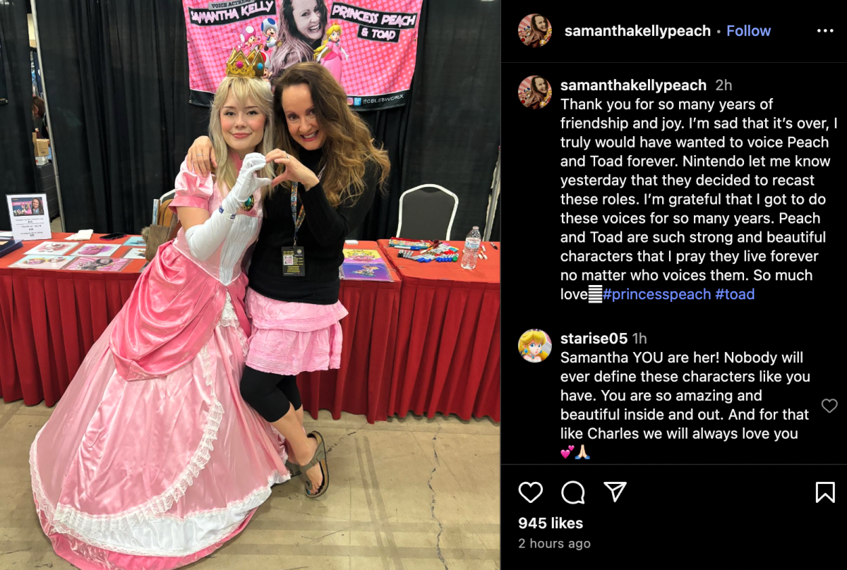 Here’s a screenshot of voice actress Samantha Kelly announcing she no longer plays Peach or Toad in Super Mario games starting with Mario Kart World. Her full statement on the account was, “Thank you for so many years of friendship and joy. I’m sad that it’s over, I truly would have wanted to voice Peach and Toad forever. Nintendo let me know yesterday that they decided to recast these roles. I’m grateful that I got to do these voices for so many years. Peach and Toad are such strong and beautiful characters that I pray they live forever no matter who voices them. So much love.”
