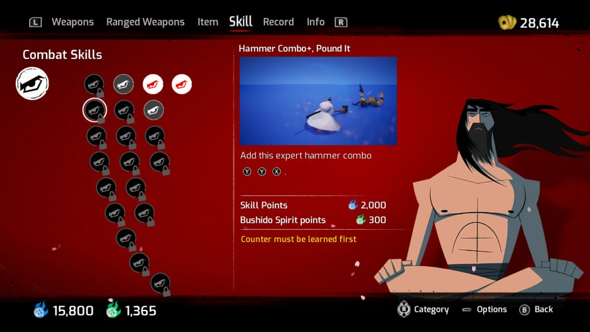 It’s important to note that your weapons can and will take damage. Whenever you spot Da Samurai in your vicinity, make sure to pay him a visit. You’ll want to check the status of your weapons and see if they need repair. I lost two bows to poor weapon maintenance. I pushed them too far and they broke, vanishing from my inventory and leaving me with a bundle of arrows. Da Samurai also offers special weapons training. Spending gold on this service increases the stats for the selected weapon class and unlocks new moves. So far I’ve focused on improving my sword and spear attacks.