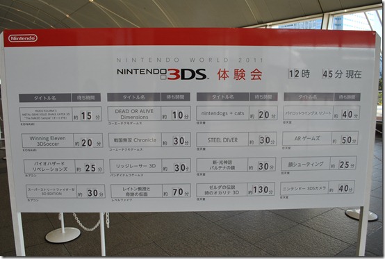 The wait to play The Legend of Zelda: The Ocarina of Time 3D at Nintendo World was the longest at 130 minutes, over two hours for a demo. Professor Layton and the Mask of Miracle was 70 minutes and AR Games had the third longest waiting time with 50 minutes.