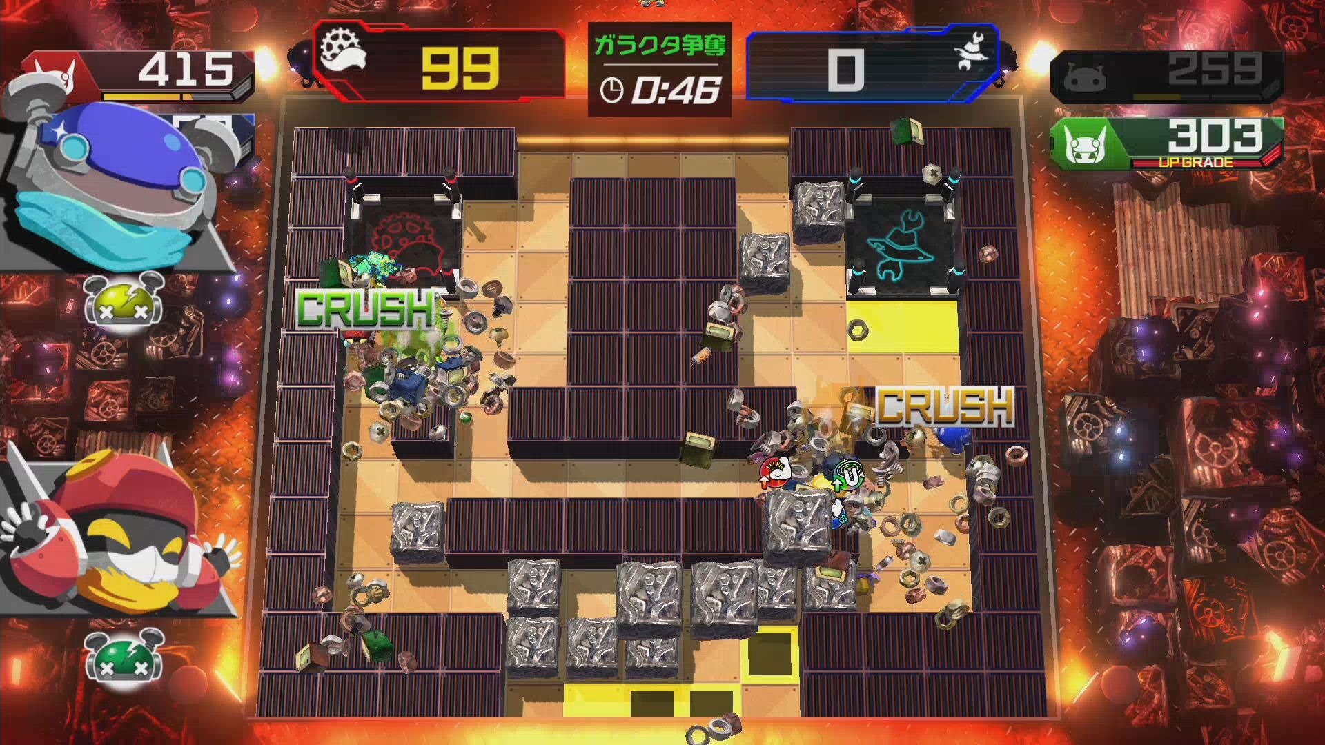 In Challenge Mode, you can team up with up to three other players in order to clear ten stages with a tough Dark Scrapper boss at the end. Meanwhile, Scrash Mode is a singleplayer mode where you need to defeat up to 99 waves of enemies and survive to the end. Finally, Battle Mode is the basic versus content against other players where you need to collect scrap to win.