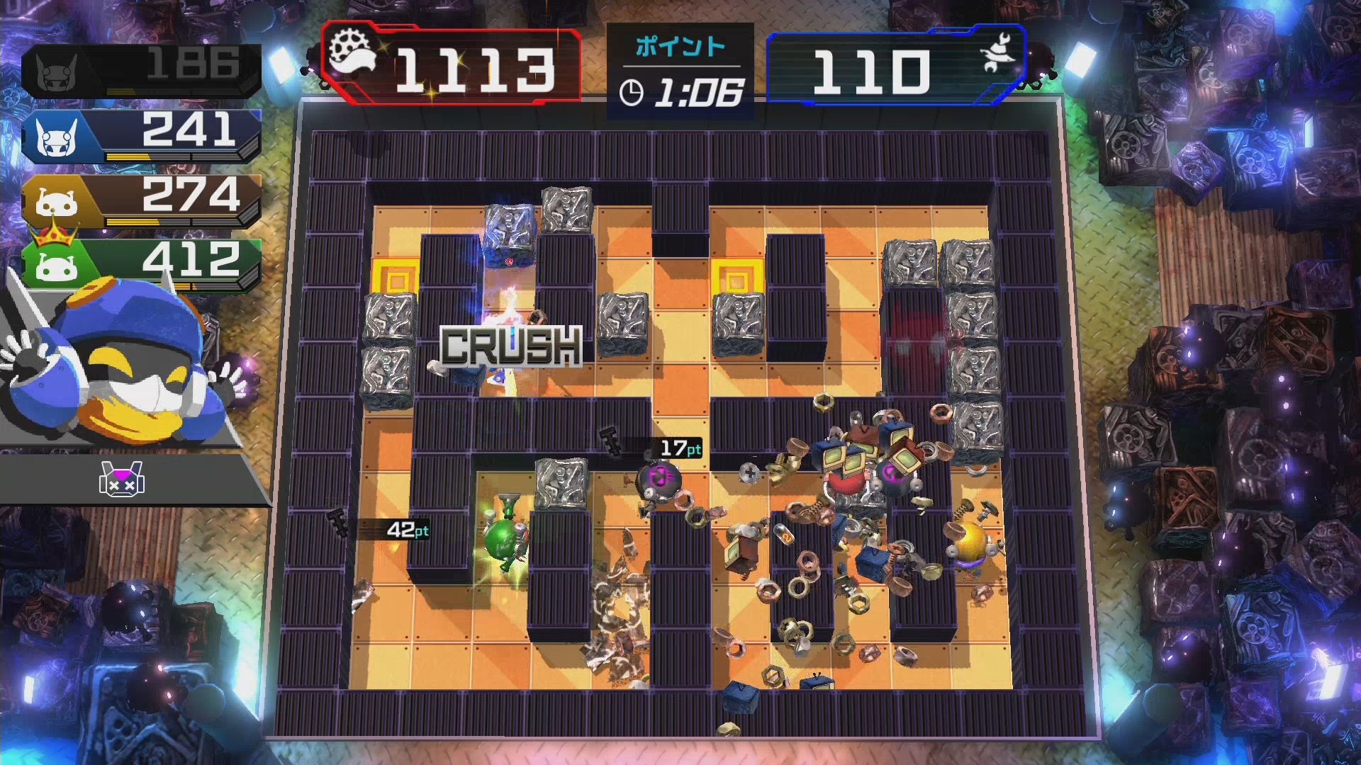 Acquire’s newcomer-led versus game Scrap Rush!! comes out today, and more has been shown off regarding some of the game’s other modes like Challenge Mode, the singleplayer Scrach Mode, and the various battle modes. [Thanks, 4Gamer!] As previously discussed, in this game you need to collect the most scrap to win. However, just collecting what’s on the field isn’t enough to give yourself an edge, so you’ll need to defeat your opponents by crushing them with scrap blocks and collect their remains as well, and power up when reaching a certain amount of scrap.