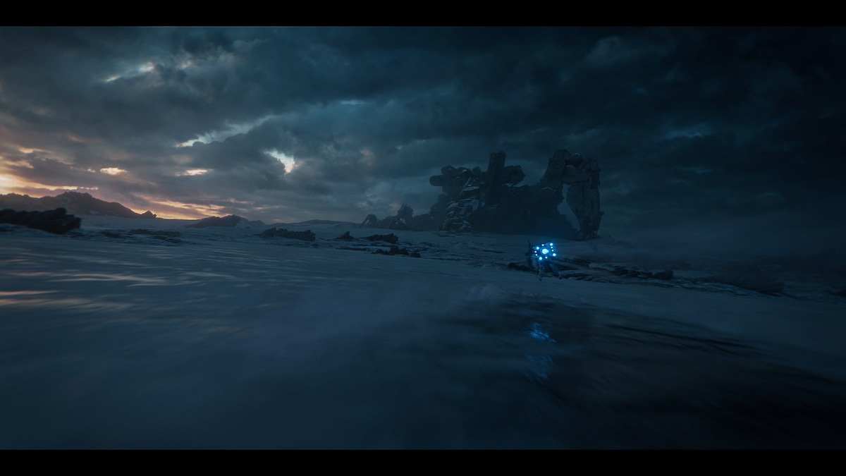An Armored Core Flies over an Icy Wasteland in Secret Level, the anthology series.