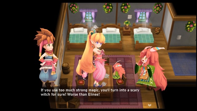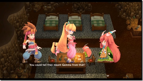 There is a downside to this. The problem with the Secret of Mana skits is that they stack. If someone is really good at playing the game and finds themselves not needing to stay for a night very often, then eventually in four hours or so they will be past the Pandorian Ruins and only just hearing about how Primm had to save Randi from being a stew. The game expects you to stay in an inn after every major event, and if you do not it will kind of break the immersion.