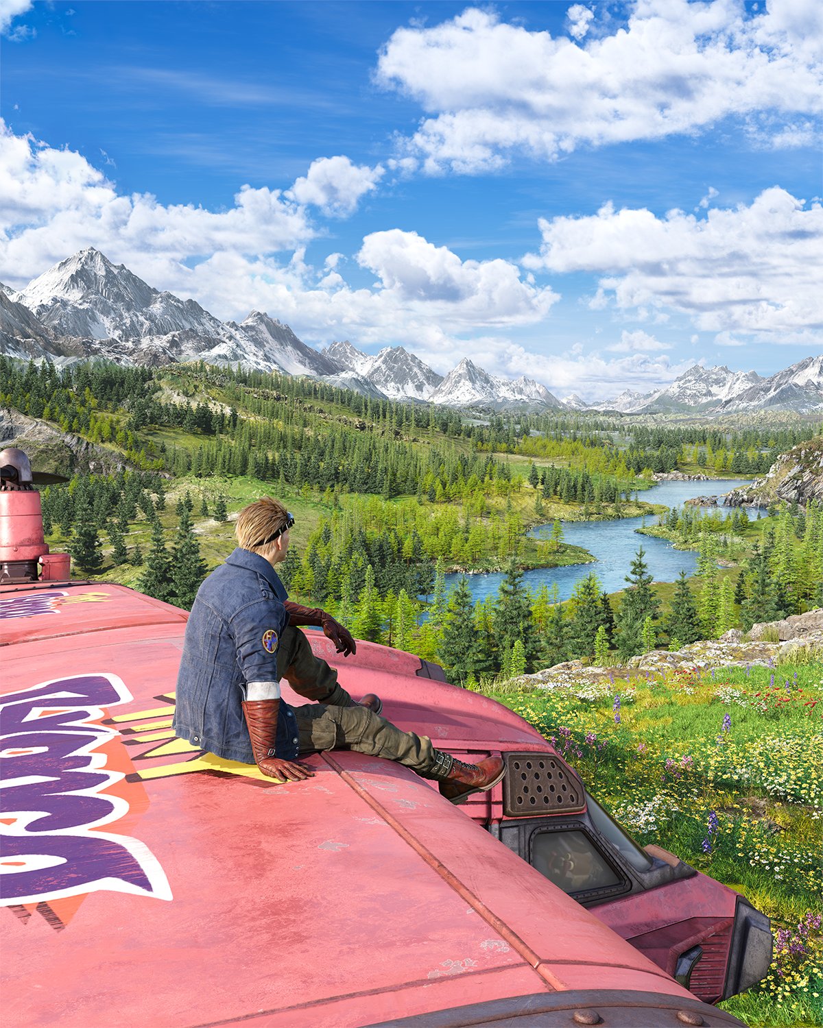 Each of the images feature the characters in a location relevant to their story, with Cid sitting atop the landed plane Tiny Bronco, and Vincent brooding over a stormy Nibelheim. Red XIII stands next to the petrified body of his father, and Aerith is pictured kneeling and praying to the lifestream. Each one of these images is based on an original piece of key art from the PlayStation release.