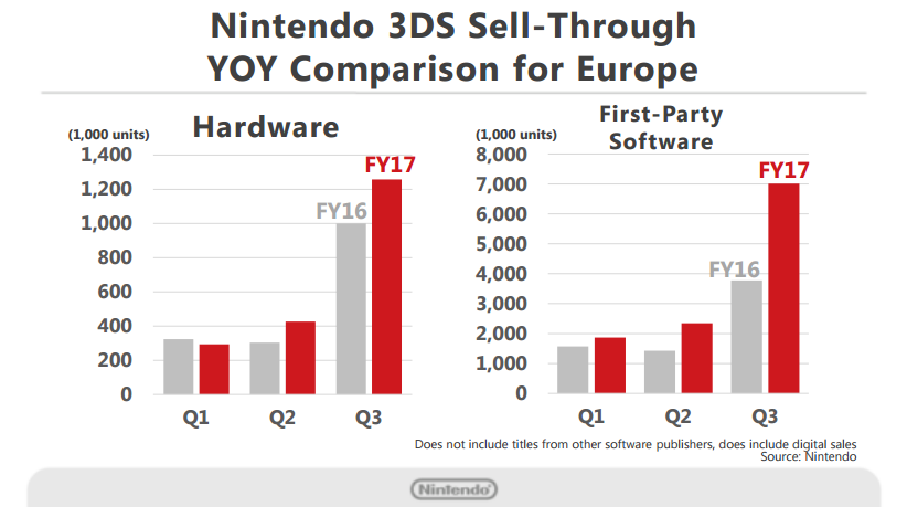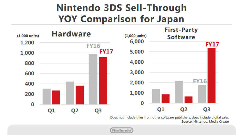 This graph shows Nintendo 3DS hardware and software sell-through in the U.S. compared with the previous period. In the U.S., promotional activities aimed at children and parents were effective at increasing sales. We believe we were able to assert brand presence during the holiday season, including Black Friday, through Pokémon Sun and Pokémon Moon. This was the sixth year-end period since the launch of Nintendo 3DS, but major titles continued to drive hardware sales, and sell-through of hardware and software for the entire year was up compared to the previous year.
