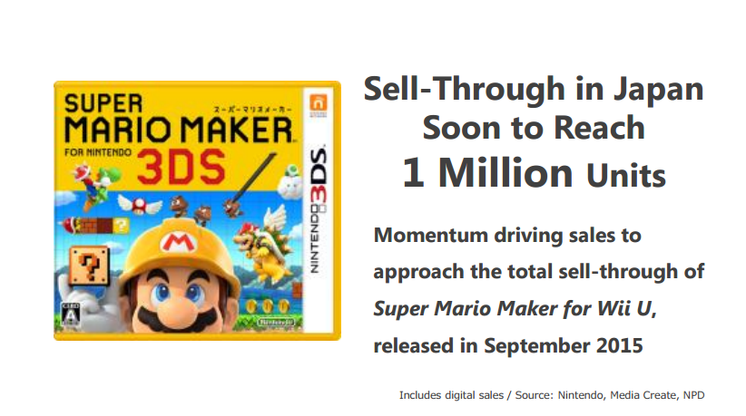 Super Mario Maker for Nintendo 3DS, released in December last year in Japan, continues to sell well and is expected to become a million seller soon. In Japan, this title has the momentum to close in on the total sell-through for Wii U version, which launched the previous year. We were able to reach consumers who own a Nintendo 3DS system, but who do not own a Wii U system. This shows the size of the latent Nintendo 3DS market. This title is also off to a good start in the U.S. and Europe, where it was released in December as well.