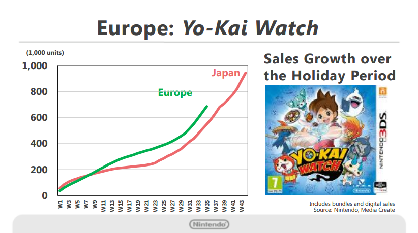 We have previously shared how the first title in the Yo-Kai Watch series, sold by our local subsidiary in the European market, was released in April last year and quickly surpassed initial sales of the Japanese release. This graph compares the sell-through in the European market with the earlier release in the Japanese market. Sales growth has maintained momentum even through the holiday period in Europe. High demand from children hoping to receive this title as a present has produced measurable results. The animated television show is also expanding to more regions, so we can expect further growth from this franchise in the future.
