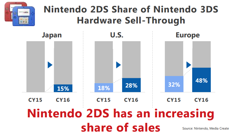 This graph shows the share of Nintendo 2DS within the total Nintendo 3DS hardware sell-through per region, compared with the previous period. Nintendo 2DS is offered at an even more affordable price than other hardware in the Nintendo 3DS family, and children can easily enjoy playing with it as their first game system. It launched in the Japanese market in September last year. We reduced the price of Nintendo 2DS in the U.S. market in May last year and saw an increase in sales that exceeded our expectations. As you can see, the share of sales held by Nintendo 2DS has grown over the previous year in the U.S. and European markets.