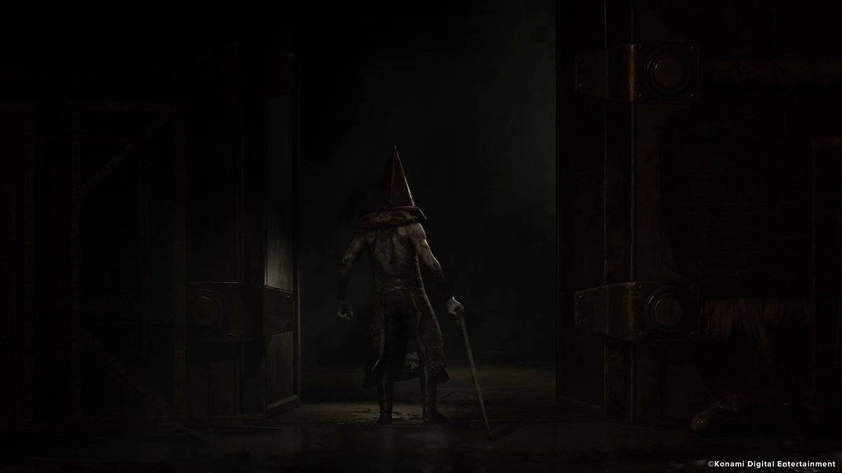 Very little context was offered for the new Silent Hill 2 screenshot of Pyramid Head. Konami only noted it is a “back shot” of the character. Due to the lighting, it is difficult to see many details. However, we can see the back of the creature’s distinctive head, notice how the apron he wears doesn’t cover his back, and see he is still dragging his trademark knife.