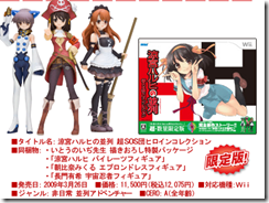 And what would a Haruhi game be without collectable special editions? The Wii game comes with three figures including pirate Haruhi. The DS game includes a soft DS Lite pouch, game carrying case, stickers, and a Choro-Q Mazda RX-7.