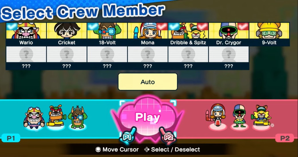 It confirmed Wario, Cricket, 18-Volt, Mona, Dribble & Spitz, Dr. Crygor, and 9-Volt will be among the playable characters. An additional six characters appeared as mystery characters. While Dribble & Spitz appear in one slot, if two people are playing then one person can be Dribble and the other Spitz. In the Nintendo Direct announcement, Ashley was confirmed as a character too.