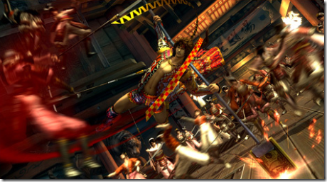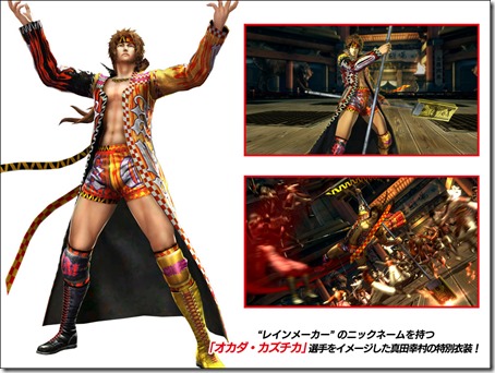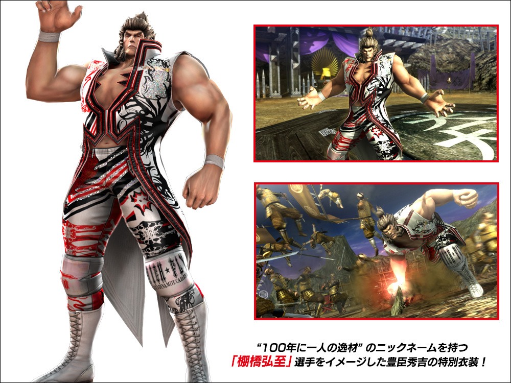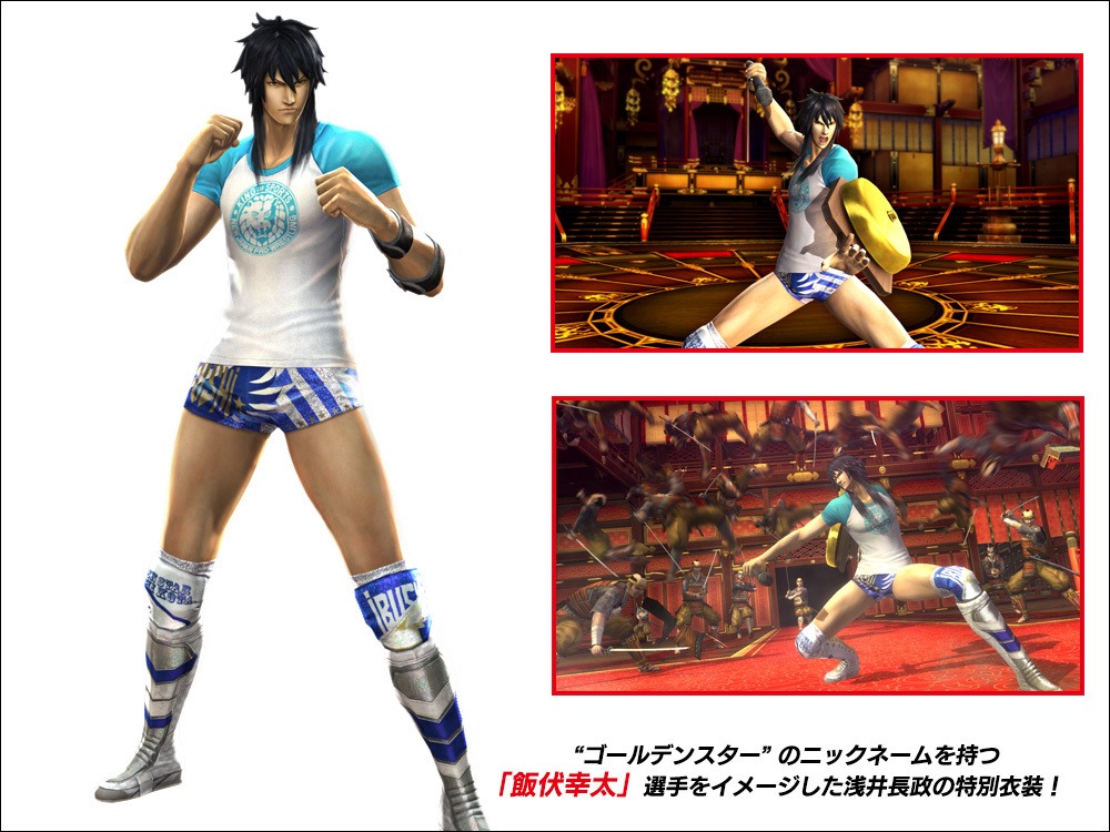 We previously reported that Sengoku Basara 4: Sumeragi, the updated version of Sengoku Basara 4 by Capcom, is getting costumes for T.M. Revolution from one of his earlier music videos. The newest collaboration announced is one for the fans of New Japan Pro Wrestling. [Thanks, Game Jouhou.] The following is a look at the collaboration costumes that will be available via DLC once the game is released. Shima Sakon as Shinsuke Nakamura: