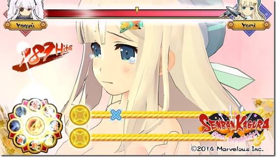 The rhythm part of this game is clearly not its focus. Easy mode is effectively a guaranteed perfect clear, Normal mode isn’t too hard either (aside from Daidouji’s theme, which I can’t clear the third round of to save my life), but that’s when the game starts getting some fun patterns to play through. While the layouts were fun, the music, which has everything from ninja-esque themes to jazz to J-rock didn’t really hook me. In fact, I don’t think I could hum you single bar with the exception of one character theme that incorporates a wedding march in a way that reminds me of Parodius. Don’t expect the visual variety of something like Project Diva F or DJ Max Technika Tune, either. There are two stages in the entire game. Your only variety comes from who you’re fighting and how you’ve dressed your characters. Because the game often rewards you with unlockable clothing, lingerie, and accessories, which you can customize your character with after every match. Bon Appetit it draws you into a Pavlovian loop: perfect song, see nudity, customize for next round. It’s interesting that your customizations don’t just end with your playable character. Your foes will appear in battles and cutscenes however you dressed them. It makes you feel as though your successes have some overarching purpose, as bizarre or lurid as the results may be. There’s something strangely compelling about playing through the story mode over and over, just to see what you can unlock.