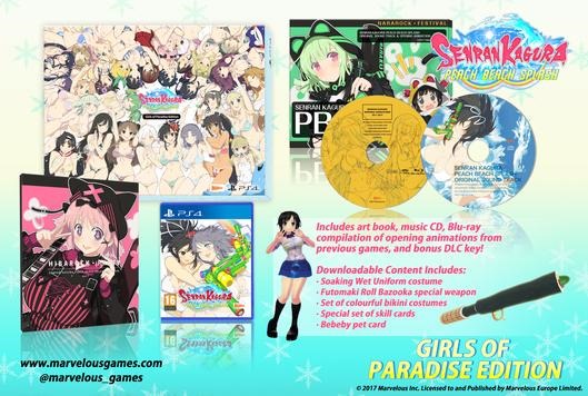 The Senran Kagura: Peach Beach Splash Girls of Paradise Edition will be available via the Marvelous Store and cost €69.99/£59.99. It will give people the game, a Blu-ray with every Senran Kagura game opening animation, an art book, the Senran Kagura: Peach Beach Splash Original Soundtrack, and the Colorful Bikini Costumes, Bebeby Pet Card, Futomaki Roll Bazooka Special Weapon, Soaking Wet Uniform Costume, and Skill Card Set DLC.
