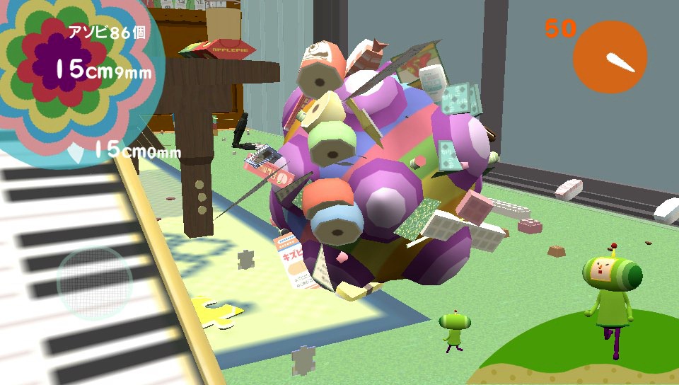 So, what’s new for this Katamari game? Shape shifting katamaris. In Japan, the game is called Katamari Damacy no Vita, which (if you ignore the heart) could be read as Katamari Damacy Nobita where "nobita" means to stretch. And stretching your katamari in odd shapes that should make it more difficult to roll is what the next game in the Katamari series is all about. Players can use the rear touch pad to stretch and shrink their Katamari. Levels will be designed with narrow gaps to squeeze through.