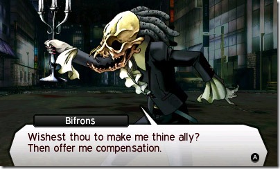 Shin Megami Tensei IV’s cast of characters is vivid, too. Their portraits are well-drawn and their voices portray their emotions well. I love how the AI Burroughs also seems to have her own personality. Their interactions are a pretty large focus of the game, and anything that happens to the characters feels more real than if they weren’t as developed. While I feel that the writing is sometimes inconsistent in terms of word choice, ultimately the game is very well-written and doesn’t come across as stiff. The characters aren’t the only “people” with personalities, though. The demons are also all very unique. Each one is voiced (not with unique voices, mind you; that would be a lot of voices) and they taunt and growl at you as you negotiate with them or fight them. They each have their own personality when they talk, complete with different capitalization patterns in their text and speech patterns. It’s the kind of thing you can only do in a videogame.