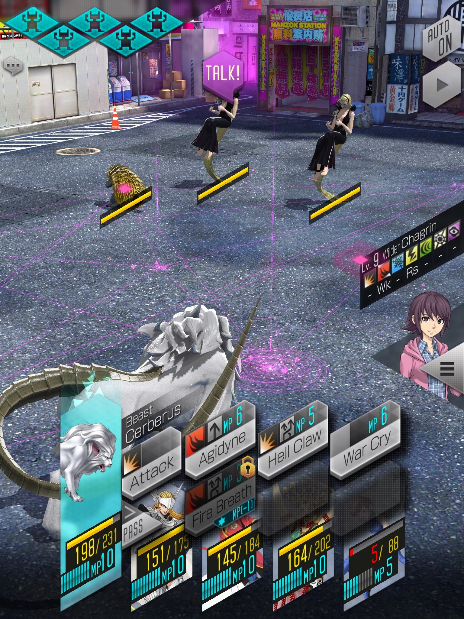Fights are turn-based, with each of your demons and each of the opposing demons in every wave getting one attack each round. That is, unless you hit a weakness. Then, you only use up half of your in-round turn and can earn more turns to attack. Your opponents’ weaknesses are shown when targeted, provided you have fought and found them before. The creatures in your party have skills that they can get from transferring and awakening. Everyone has elemental strengths and weaknesses. It just flows well and works. I especially like how these make you think more critically about skill usage, as characters have a limited amount of MP and fights happen one-after-another in each story segment. It might mean you have to consider getting through earlier rounds quickly and unscathed, but then risk a harder fight later with no MP.