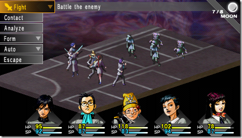 Battles in Shin Megami Tensei: Persona use a different system too. The crux of fights is still exploiting weaknesses, but now you have a wealth of attacks to manage. Nuclear, gravity, earth, expel, miracle, guns… the “element” list is lengthy. Even if you have the right spell you have to make sure your character is in the right position to hit a target. Persona has a strategy RPG style grid where attacks have a fixed range. Mark’s shotgun, for instance, mainly hits enemies in the middle, if you put him in the front row. Place Mark in the middle of your grid and he can shoot enemies in the front row, but if you do that his axe won’t be able to hit anyone. There’s a bit more strategy to SMT: Persona’s battle system than knocking enemies down and going for an all out attack. The thing that players need to watch out for are status attacks. Just like the list of elements there are a plethora of status effects ranging from staples like HP draining poison to happiness (your character may not listen to you) and guilt (can’t use physical attacks). Each status effect has a degree too. Higher levels of guilt prevent your character from casting sword slashing and spell slinging.