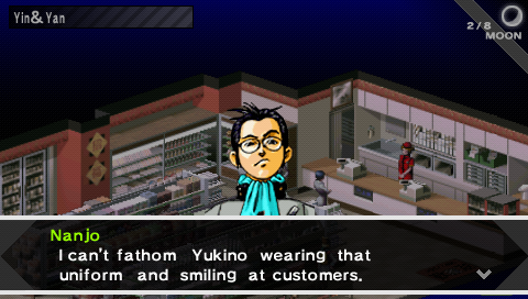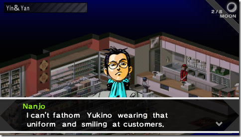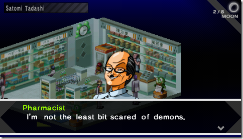 The story and bizarre world is what made and still makes Persona worthwhile. In the beginning of the game you and a bunch of misfits play a tag-like game in a classroom while bellowing “Persona!”. This summons butterflies and Philemon, a masked man who bestows the ability to summon personas. There isn’t time to date your teammates after that since a barrier seals everyone in town and demons start appearing. Good thing 7-Elevens carry assault rifles. The journey takes players through “worlds” and neatly wraps up the question “what are Personas?”