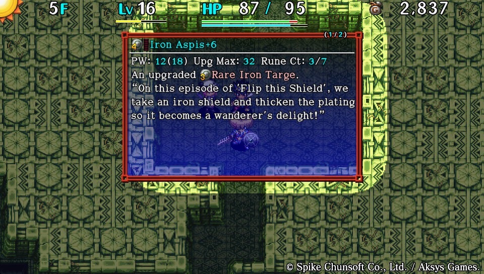 In short, Shiren the Wanderer: The Tower of Fortune and the Dice of a Fate is the sort of game you should savor. The nature of its dungeon crawling allows you to move more deliberately, since enemies only take action when you do. Towns are safe spaces where enemies can’t invade. There’s plenty of time to stop, look around, read about the things you’re encountering, and enjoy the effort Spike Chunsoft and Aksys put into it. Every time I play, I can’t help but think this was a true labor of love and wonder if other people are noticing and appreciating the artistry and wordplay.
