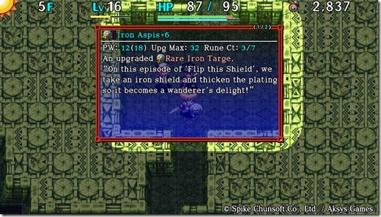 Aksys and Spike Chunsoft went all out to make these appealing. Take the one for the Pit Mamel, one of the first creatures you’ll find in your wanderings. It says, “It’s level 2, but it’s a Pit Mamel so it still dies oh, so easily. This news comes as a shocking revelation to it.” It’s silly, descriptive, and never fails to make me smile. Certainly, some descriptions offer helpful insights. The Sweet Nut’s reminds you to toss an item into it to possibly make it explode or get more experience. But the majority feel like a happy reward for taking the time to actually learn more about them. Item descriptions are equally detailed and lighthearted, but are more often informative than entertaining. The weapons and shields in particular are more flavorful, since some of the other staves, seals, scrolls, and other pieces require actual explanations and the improving equipment allowed for a little more levity.