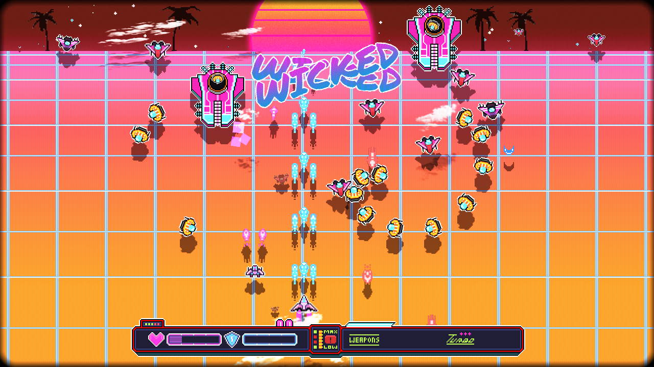 NIGHTHAW-X 3000 uses a scrolling effect where enemies and obstacles appear to be rolling down from the top of the screen. The screen will also shift and tilt, changing the player’s perspective and movement to increase the game’s challenge. Players can buy new weapons or bring in a local co-op partner to make things easier for themselves, though.
