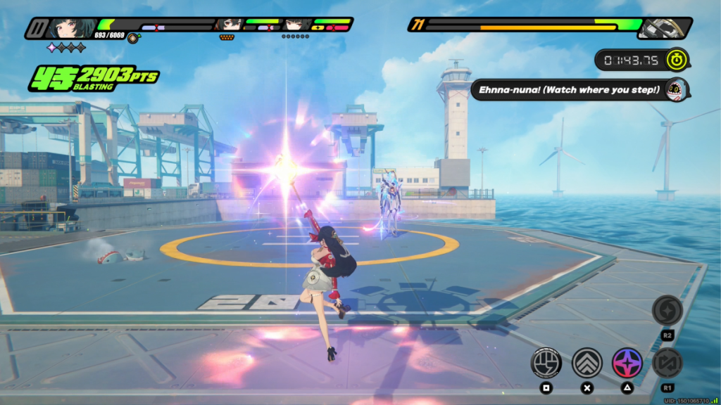While in Idyllic Cadenza, Astra cannot move aside from a backwards dodge activated through her Special Attack. Her basic attack also somehow gets slower in this stance. The only way to escape this stance is through holding the attack button, which slowly activates a long sweeping attack that lets her move again.
